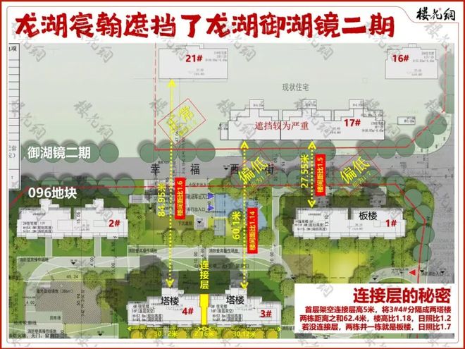 真实的情况是,龙湖宸翰的3#和4#作为塔楼,其中3#和龙湖御湖镜二期17#之间,为1.14,低于1.2的最低标准0.06;4#和龙湖御湖镜二期21#的楼间距比1.6,属于正常范畴。