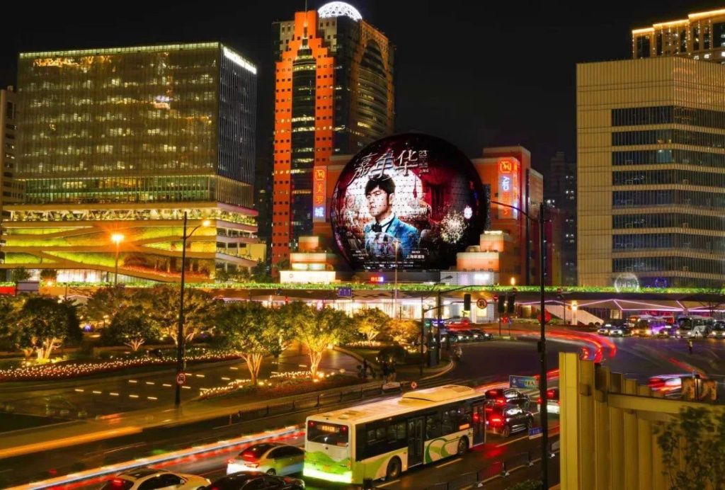 上海徐家汇商圈,2023年10月周杰伦上海演唱会期间,美罗城3D球幕上展示的相关画面。上海徐汇 图