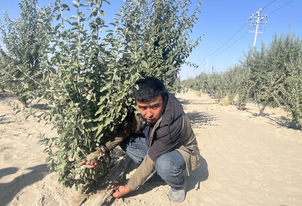 阿卜杜萨拉木塔力普在检查梭梭林的滴灌。新华社记者 杨林 摄
